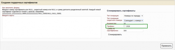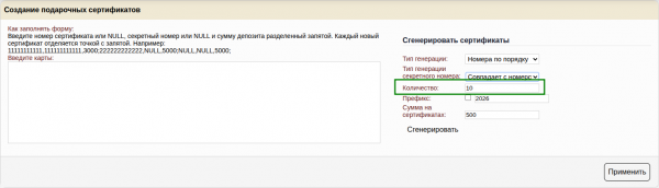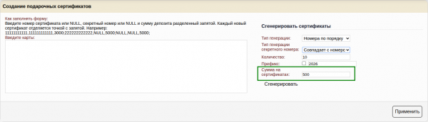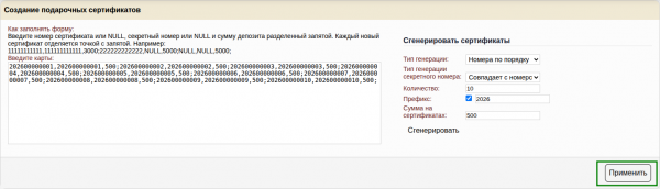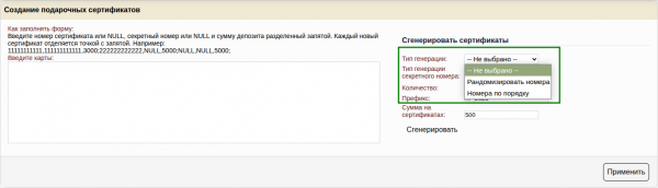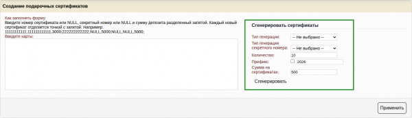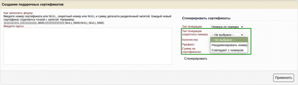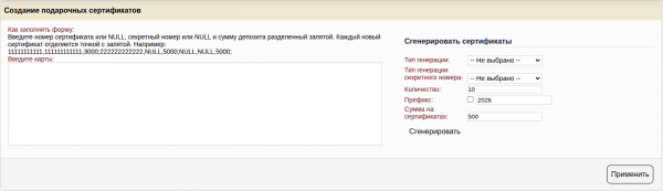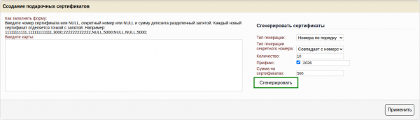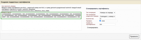 Генератор позволяет сгенерировать подарочные сертификаты по правилам генерации, которые позволят вам использовать сертификаты с из типографии, при условии, что сертификат имеет числовой номер