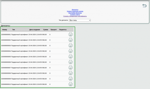 Укажите количество сертификатов, которое нужно сгенерировать. Укажите, требуется ли добавить префикс к сертификату. Если префикс нужен, то установите «галочку» и укажите префикс в поле справа. Префикс будет добавлен в начало номера депозита Укажите, какая сумма должна быть присвоена на подарочный сертификат. Указанная сумма будет зачислена на сертификат и позволит оплатить услуги клиники. Когда все готово - нажмите «Сгенерировать» Вы увидите, что поле слева от генератора будет заполнено необходимой информацией. Если Вас все устроило - нажмите кнопку «Применить». Когда вы вернетесь на предыдущий экран, вы увидите новые сертификаты в списке